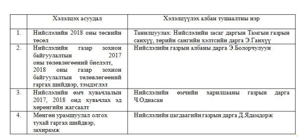 Мөн хуралдаанаар Нийслэлийн газар зохион байгуулалтын 2017 оны төлөвлөгөөний биелэлт, 2018 оны газар зохион байгуулалтын төлөвлөгөө, Нийслэлийн өмч хувьчлалын 2017 оны дүн, 2018 онд хувьчлах эд хөрөнгийн жагсаалт гэсэн асуудлуудыг хэлэлцэнэ.