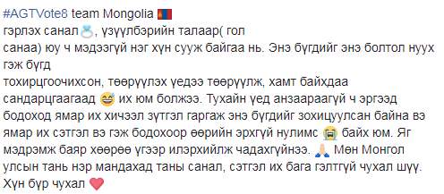 Саналаа өгөх хүсэлтэй хүмүүс ганц л хаштаг # буюу чагт ашигласан пост эсвэл сэтгэгдэл бичнэ. Жишээ нь #AGTVote8 гэж бичих юм байна.