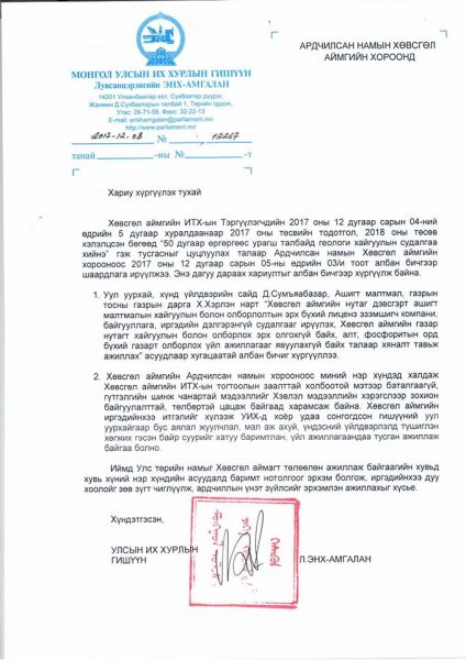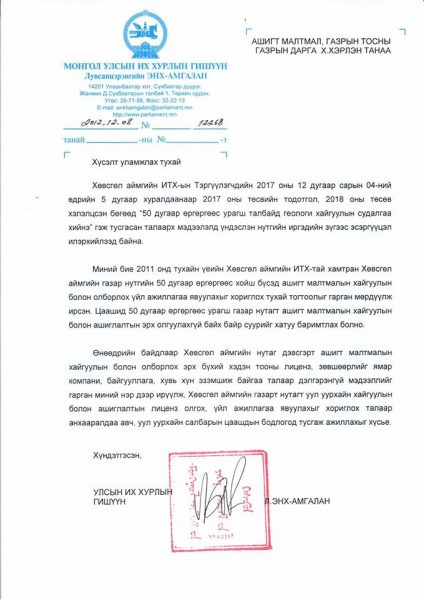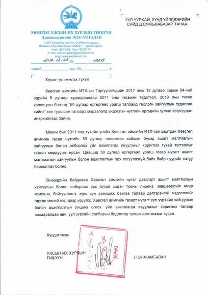 Үүний зэрэгцээ Хууль тогтоох дээд байгууллагад хөвсгөлчүүдийг төлөөлдөг хүний хувиар Уул уурхай, хүнд үйлдвэрийн сайд Д.Сумъяабазар, Ашигт малтмал, газрын тосны газрын дарга Х.Хэрлэн нарт хандаж, хугацаатай албан бичиг хүргүүлсэн нь цаг үеэ олсон хэрэг. Ямартай ч хариуцлагын тогтолцоо өндөрсөж, үүнийг сахиулдаг түшээд цөөнгүй байгаа нь хөвсгөлчүүдийн хувьд найдаж болох ганцхан зүйл. Тиймдээ ч тэрбээр “цаашид Хөвсгөл аймагт уул уурхайн хайгуулын болон ашиглалтын зөвшөөрөл олгуулахгүй байх, одоо байгаа зөвшөөрөл, лиценз эзэмшдэг компани, хувь хүн, байгууллагын судалгааг ил тод болгох, ИТХ-аас гардаг ашигт малтмалтай холбоотой тогтоол шийдвэрт хяналт тавьж, цуцлуулах талаар чиглэл өглөө” хэмээжээ.