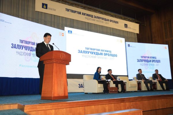 Монгол Улсын Ерөнхий сайдын ивээл дор Хөдөлмөр, нийгмийн хамгааллын яам, Гэр бүл хүүхэд залуучуудын хөгжлийн газар хамтран “Тогтвортой хөгжилд залуучуудын оролцоо” үндэсний чуулганыг 2017 оны 12 дугаар 12-ны өдөр Төрийн ордонд зохион байгуулж байна.