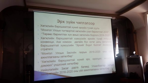 Тэргүүлэгчдийн хуралд Хөгжлийн бэрхшээлтэй иргэдийг дэмжих нийслэлийн дэд хөтөлбөрийг Нийслэлийн Нийгмийн халамжийн газрын дарга Т.Оюунчимэг танилцууллаа. Тэрбээр танилцуулгадаа Нийслэлийн хэмжээнд 2017 оны байдлаар 33713 хөгжлийн бэрхшээлтэй иргэн амьдарч байгаагийн 16204 нь эрэгтэй, 17509 нь эмэгтэй, 0-14 насны 3421 хүүхэд амьдарч байна. Эдгээр иргэдийг хөгжлийн бэрхшээлийн төрлөөр нь ангилж үзвэл харааны бэрхшээлтэй 10 хувь, хэл ярианы бэрхшээлтэй 5 хувь, сонсголын бэрхшээлтэй 8 хувь, хөдөлгөөний бэрхшээлтэй 19 хувь, сэтгэцийн бэрхшээлтэй 17 хувь, хавсарсан бэрхшээлтэй нь 10 хувь, бусад бэрхшээлтэй иргэд 31 хувийг эзэлж байгааг дурдлаа. Эдгээр иргэд Монгол улсын үндсэн хуульд заасан эрх заяагдмал эрхээ бүрэн эдэлж чаддаггүй бөгөөд тэдний сурч боловсрох, эрүүл аюулгүй орчинд ажиллаж амьдрах, мэдээллийг жигд хүртэх эрх боломж хязгаарлагдмал байдгийг дурдаад, тэдний эрхийг хангах, нийгмийн амьдралд идэвхтэй оролцох боломжийг бүрдүүлэх, ажиллаж хөдөлмөрлөх, амьдрах ээлтэй орчин бүрдүүлэхэд чиглэсэн дэд хөтөлбөрийг боловсруулан хэрэгжүүлэх бодит хэрэгцээ байгааг хэллээ.