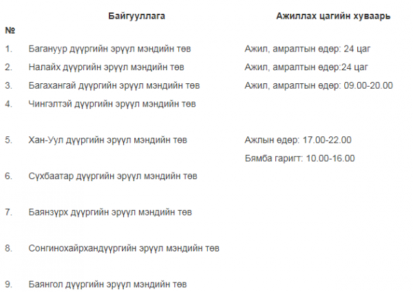 Энэ хүрээнд дүүргийн эрүүл мэндийн төвүүд ажлын болон амралтын өдрүүдэд доорх цагийн хуваарийн дагуу ажиллаж эхэлсэн бөгөөд томуу, томуу төст өвчний талаархи зөвлөгөө мэдээлэл болон эмнэлгийн тусламж, үйлчилгээг түргэн шуурхай, хүртээмжтэй байдлаар үзүүлэхээр зорьж байна.