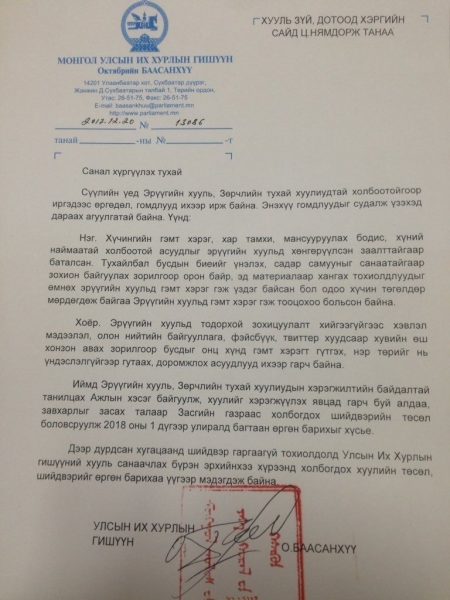 УИХ-ын гишүүн О.Баасанхүү Хууль Дотоод Хэргийн сайд Ц.Нямдоржид албан шаардлага хүргүүллээ.