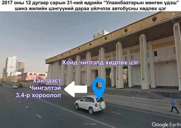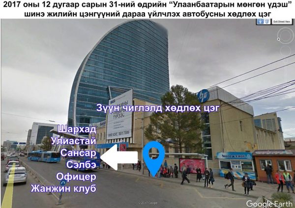 Нийслэлийн шинэ жилийн баярын үйл ажиллагааг зохион байгуулах ажлын хүрээнд 2017 оны арванхоёрдугаар сарын 31-ний өдөр “Шинэ жилийн баярын цэнгүүн”-ийг Сүхбаатарын талбайд зохион байгуулах ба олон нийтийг хамарсан ёслолын арга хэмжээний дараа иргэдийг нийтийн тээврийн үйлчилгээгээр хангахаар дараах төлөвлөлтийг нийслэлийн Тээврийн газраас хийгээд байна.