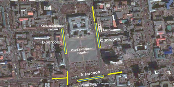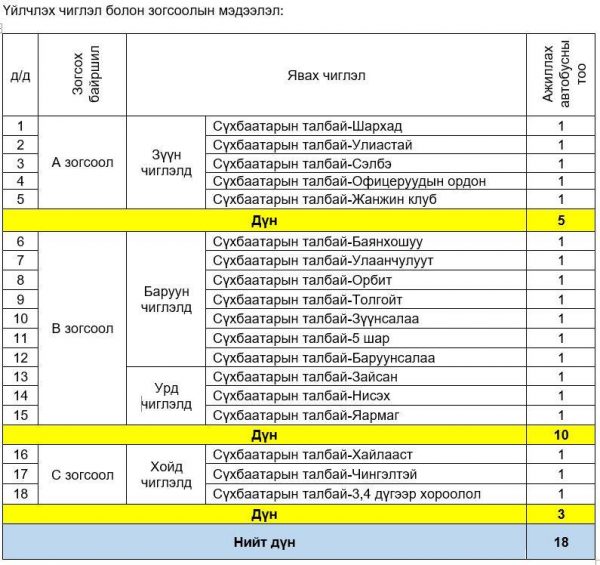 “Шинэ жилийн баярын цэнгүүн” нэгдсэн үйл ажиллагаа өндөрлөхөд их багтаамжийн автобусны 18 чиглэлд 18 автобус Сүхбаатарын талбайн баруун, зүүн болон урд зогсоол буюу зурагт тэмдэглэсэн “А”, “B”, “С” зогсоолоос суурьшлын цэгүүд рүү үнэ төлбөргүй үйлчлэхээр төлөвлөөд байна.