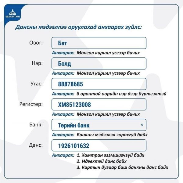 Албан татварын буцаан олголтоо авах Монгол Улсад бүртгэлтэй банк, дансны дугаар. Албан татвар төлөгч нь журмын дагуу бүртгэлийн мэдээллийн үнэн зөвийг өөрөө хариуцах үүрэгтэй.