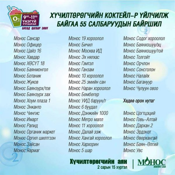 Монос эмийн сангийн 55 салбараар Хүчилтөрөгчийн коктейлоор 9:00-11:00 цагийн хооронд үнэ төлбөргүй үйлчилж эхэллээ.