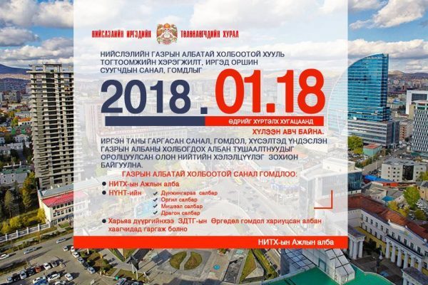 НИТХ-ын дарга С.Амарсайхан 2017 оны 12 сарын 22-ны өдөр 93 тоот захирамж гаргаж, тус захирамжид нийслэлийн иргэд оршин суугчид газрын албатай холбоотой хууль тогтоомжийн хэрэгжилт, иргэд оршин суугчдын санал гомдлыг НИТХ-ын ажлын алба болон Нийслэлийн үйлчилгээний нэгдсэн төвүүдэд 2017 оны 12 сарын 22-ны өдрөөс 2018 оны 1 сарын 18-ны өдөр хүртэл хүлээн авч эхэлсэн. Эдгээр санал гомдолд үндэслэн олон нийтийн хэлэлцүүлэгийг энэ сарын 22-ны өдөр Соёлын төв өргөөнд зохион байгуулахаар болжээ.