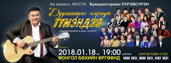 Ая зохиогч Б.Пүрэвсүрэнгийн шинэ уран бүтээлүүдийг нэгэн тайзнаа хүлээн авч үзээрэй “Дуулахаараа жаргадаг түмэндээ” тоглолт 01-р сарын 18-нд 19 цагаас Монгол бөхийн өргөөнд болно.