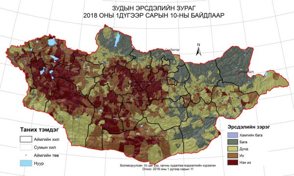 Зудын эрсдэлийн зургаас үзвэл нийт нутгийн 50 орчим хувьд их (20% нэн их, 28% их), 30 гаруй хувьд (32%) нь дунд зэрэг эрсдэлтэй гарчээ.