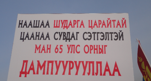 Сүхбаатар аймгаас жагсаалд оролцож буй иргэн н.Буд Манай аймаг “улсын тэргүүний аймаг”-аар олон жил шалгарч байсан. Гэтэл сүүлийн жил улсын хэмжээнд ядуурлаараа сүүл мушгилаа. Аймгийн удирдлагууд юу ч хийсэнгүй. Тиймээс л би үзэл бодлоо илэрхийлж, төр засгийн буруутай үйл ажиллагааг шүүмжлэхээр хүрэлцэн ирлээ.