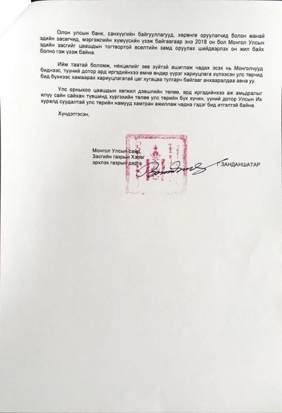 Ардчилсан намаас Засгийн газарт ирүүлсэн шаардлагын хариуг Монгол Улсын сайд, Засгийн газрын Хэрэг эрхлэх газрын дарга Г.Занданшатар өчигдөр хүргүүлэв.