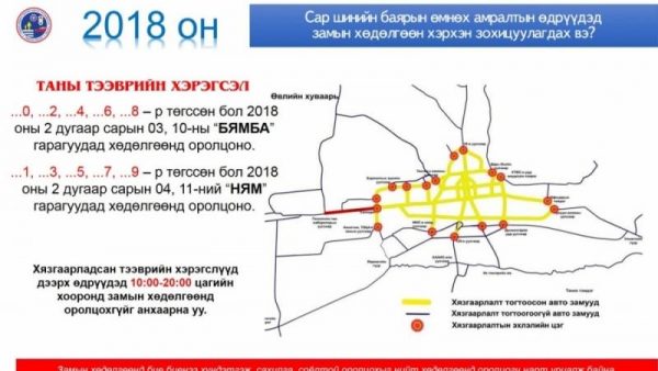 Шинийн нэгнийг хүртэл тээврийн хэрэгслүүдийг улсын дугаараар нь ангилан хөдөлгөөнд оролцуулахаар болжээ. Хоёр сарын 3, 10-ны өдөр буюу бямба гаригуудад улсын тэгш тоогоор төгссөн тээврийн хэрэгсэл, 4, 11-ний ням гаригт сондгой тоогоор төгссөн тээврийг хэрэгсэл хөдөлгөөнд оролцох юм байна.