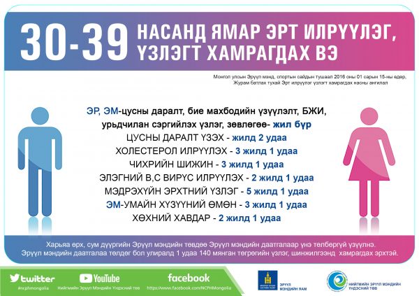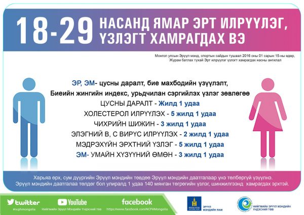 18-39 насанд ямар эрт илрүүлэг, үзлэгт хамрагдах талаарх зөвлөгөөг хүргэж байна.Харьяа өрх, сум дүүргийн эрүүл мэндийн төвдөө эрүүл мэндийн даатгалаар үнэ төлбөргүй үзүүлэх боломжтой.