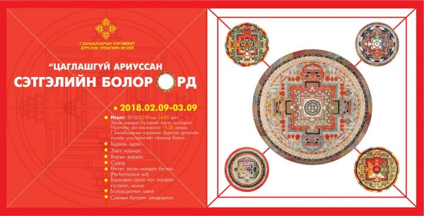 Г.Занабазарын нэрэмжит Дүрслэх урлагийн музей 2018 оны анхны үзэсгэлэнгээ XVII жарны “Тийн унжлагат” хэмээх шороон нохой жилийн сар шинийн баярын өмнөхөн “Цаглашгүй ариуссан сэтгэлийн болор орд” хэмээх нэртэйгээр дэлгэлээ.