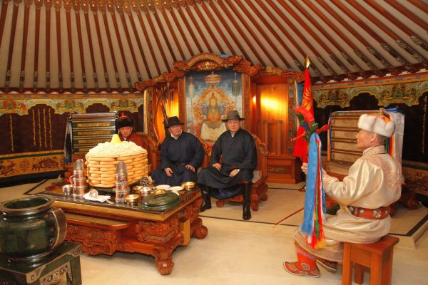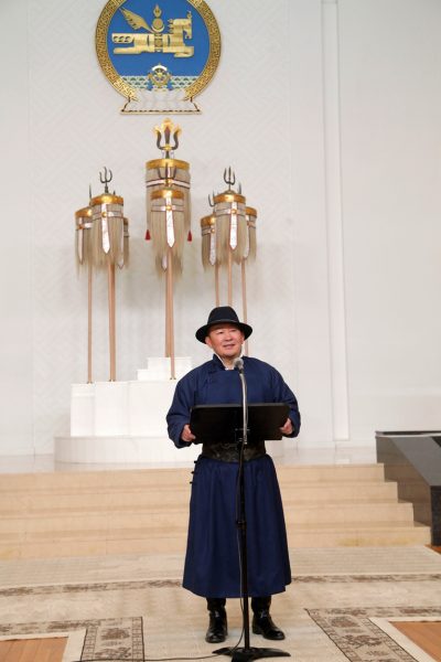 Эрэлхэг Монгол мөнх тэнгэрийн хүчин дор мандан бадартугай” хэмээн ерөөж гурвантаа уухайлав. Төрийн өндөрлөгүүд хан хуурын хөг эгшиг сайхан зохирч, цээл сайхан дуугарч байгаад бэлгэшээж байна гэлээ.
