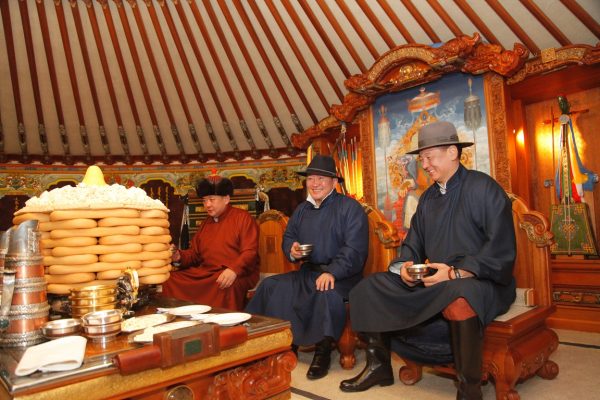 Үүний дараа УИХ-ын дарга М.Энхболд, Монгол Улсын Ерөнхий сайд У.Хүрэлсүх нар алд цэнхэр хадаг дэлгэн Төрийн тэргүүний амар мэндийг эрэн золгож, хөөрөг зөрүүлэн мэнд мэдэлцэж, налгар хавартай золгож байгаа талаар ярилцлаа.