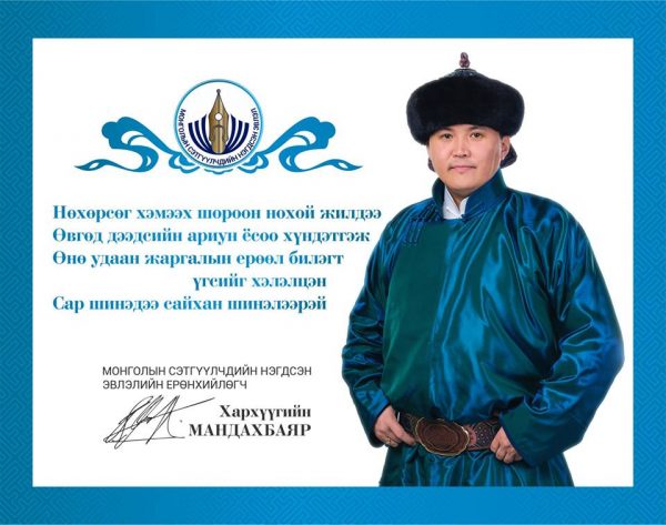 Тэнүүн дэлгэр нутагтаа аж төрөн суугаа Монгол түмэндээ болон дэлхийн өнцөг булан бүрт ажиллаж амьдарч байгаа элгэн садан Та бүхэндээ XVII дугаар жарны шороон нохой жилийн хаврын Тэргүүн сарын шинийн нэгний билэгт сайн өдрийн мэндийг Монгол Улсын сэтгүүлзүйн салбарынхны нэрийн өмнөөс өргөн дэвшүүлье.