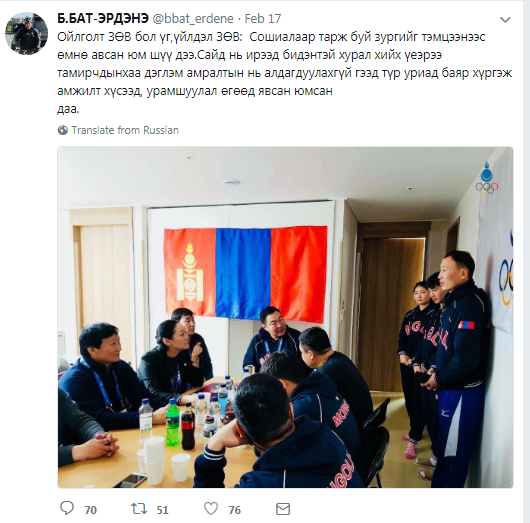 “Пёнчан-2018” Өвлийн XXIII олимпийн албан ёсоор энэ сарын 9-нд эхэлсэн.Өвлийн XXIII олимпд манай улсаас эх орноо төлөөлөн оролцож буй гурван тамирчдын зогсож буй зураг цахим орчинд тархаж олон нийтийн шүүмжлэл хүртээд байгаа юм. Тэгвэл энэ асуудал дээр Монголын баг тамирчдыг ахалсан УИХ-ын гишүүн Б.Бат-Эрдэнэ өөрийн твиттер хуудаснаа дараах тайлбарыг хийжээ.