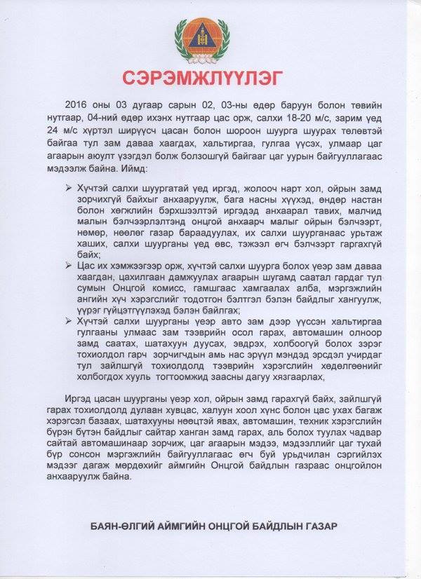 Үүнтэй холбогдуулж ОБЕГ-аас малчид ард иргэдийг хол замд гарахгүй байх, гарсан үедээ дулаан хувцас авч явах болон цаг агаарын мэдээ, мэдээллийг тухай бүрт нь авч байхыг анхаарууллаа.