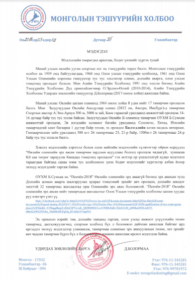 Хэвлэл мэдээллийн хэрэгсэл болон олон нийтийн мэдээллийн сүлжээгээр ойрын өдрүүдэд “Өвлийн олимпийн эрх авсан тамирчин зардлын асуудлаас болоод оролцож чадаагүй, хувиасаа 8,0 сая төгрөг зарцуулж Канадад тэмцээнд оролцсон” гэх мэтээр ор үндэслэлгүй худал мэдээлэл тараагдаж байгаад санаа зовж тус холбооноос үнэн бодит мэдээллийг хүргэхээр албан ёсоор энэхүү мэдэгдлийг гаргаж байна.
