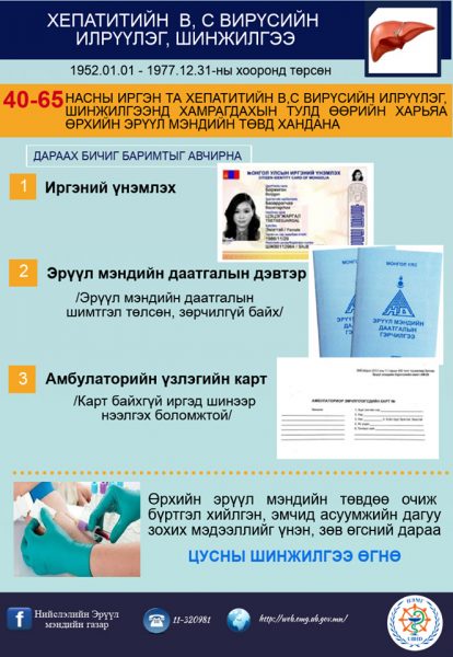 “Элэг бүтэн Монгол” үндэсний хөтөлбөрийн хүрээнд хепатитийн В, С вирүсийн илрүүлэг шинжилгээ хийгдэж эхлээд багагүй хугацаа өнгөрч байна. Тус илрүүлэг, шинжилгээнд хамрагдаж амжаагүй болон хамрагдах хүсэлтэй 40-65 насны иргэд харьяа Өрхийн эрүүл мэндийн төвдөө хандана уу гэж нийслэлийн Эрүүл мэндийн газраас мэдээллээ.
