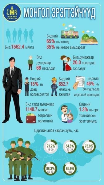 “Монгол цэргийн өдөр,” Монгол Улсад Орчин цагийн зэвсэгт хүчин байгуулагдсаны 97 жилийн ойн баярын өдрүүд тохиож байна. Тус өдрийг тохиолдуулан Үндэсний статистикийн хорооноос Монгол эрэгтэйчүүд нэртэй стастик мэдээлэл гаргажээ.