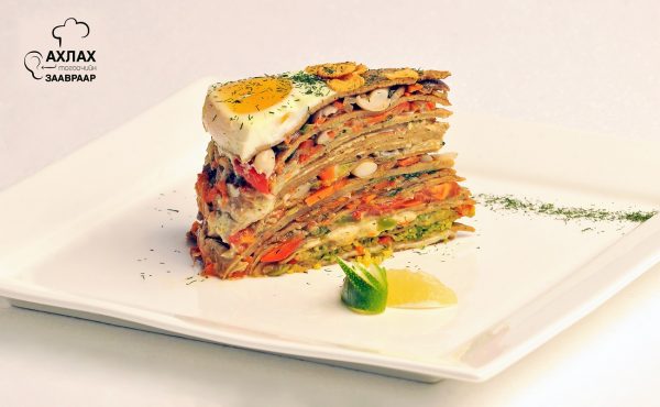 Үхрийн элгийг хальс, цусан судлаас нь цэвэрлэж, таташ болгоно.Өндөг, сүүг нийлүүлэн хутгаж, үхрийн элэг, гурил, давс хийж шарвингийн зуурмаг бэлтгэнэ. Халаасан хайруулд тос түрхэж 30-40 ширхэг шарвин бэлтгэнэ. Угааж, цэвэрлэсэн лууван, сонгино, шанцайг нарийн савх хэлбэртэй хэрчинэ. Халаасан саванд бэлтгэсэн ногоог хуурч давс болон ааг амттанаар амтыг тохируулна. Бэлэн болсон шарвин дээр ногоо, шарвин, үрсэн бяслаг гэх мэт дарааллаар үелүүлэн давхарлан тавина. Бялуун дээр өндөг түрхэж корн флейкс цацаад, 200 хэм хүртэл халаасан шарах шүүгээнд 5 хором жигнэнэ. Халаасан тостой саванд хярж хэрчсэн сонгино болон гурил хуурч, халаасан сүү нэмж сүүн сүмс бэлтгэнэ. Нунтаг задь болон давс, пвор нэмж амтыг тохируулна. Ногоон сонгиныг жижиглэн хэрчинэ.