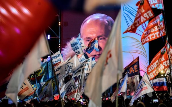Ерөнхийлөгчийн сонгуульд түүхэнд байгаагүй өндөр хувиар ялалт байгуулсан В.Путин Манежная талбайд үг хэлж байна.