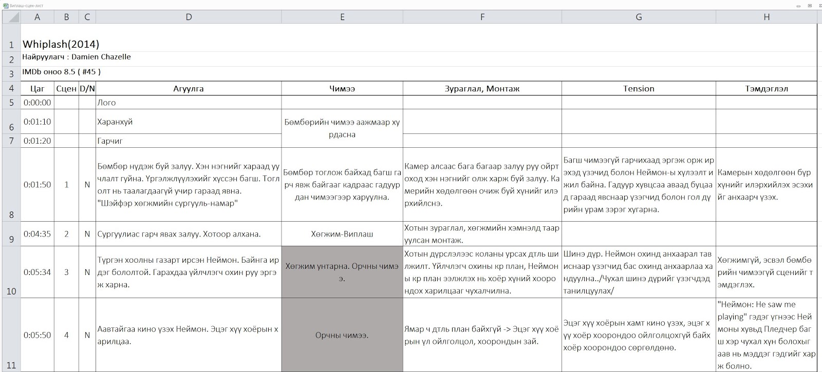 Миний хамгийн их үр дүн авдаг кино задаргааны арга бол Сцен лист гаргах юм. Кино үзээд сцен болгоноор нь задлаад хэдэн сикүэнс, хаана ямар өргөлт цохилт гарч байна вэ гэдгийг өөрийн судлах гэж байгаа өнцөгтөө тааруулаад задалж болно.