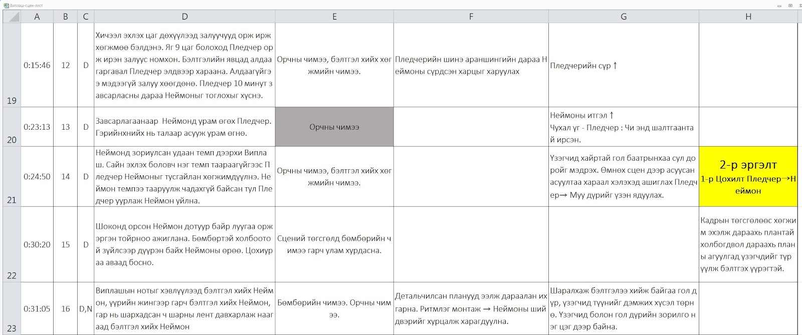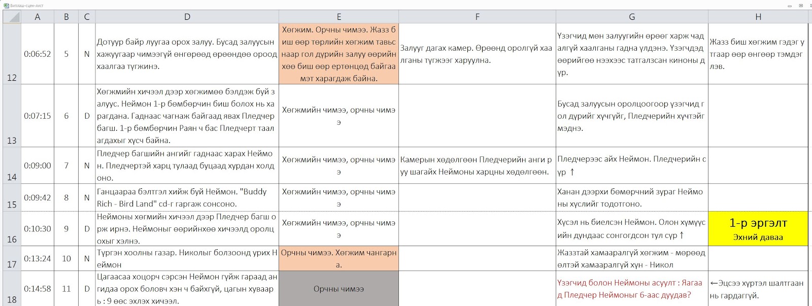 Жишээлбэл би Загалмайлсан эцэг киноны Майклын дүрийг барьж аваад түүний гэр бүлийн асуудал дээр тулгуурласан сэтгэл санааны өөрчлөлтийг хэрхэн дүрсжүүлснийг задлаж үзэх гэж байна гэж бодъё. Тэгэнгээ би бас Загалмайлсан эцэг кинон дээр гардаг жүржнүүдийн учрыг бас нэг бүрчлэн хармаар байна. За тэгвэл миний сцен лист хүснэгтэнд ямар ямар цонх хэрэгтэй вэ?