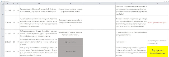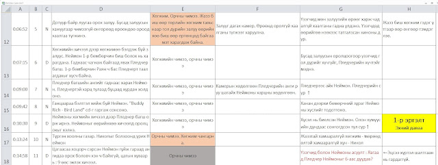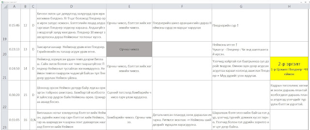 гэж гаргаж болох юм. (Би ихэвчлэн хүснэгтийн хөндлөн чигт эдгээрийг бичээд дараа нь сцен болгоноор доошоо жагсааж бичдэг. Киноноосоо шалтгаалаад байрыг нь сольсон ч болно. Таны таал.) Тэгээд жүрж гарч байгаа сценүүдийн агуулга хэсгийг өнгөөр тэмдэглээд нийтэд нь харж болно. Юуны талаар судалгаа хийх нь тогтоогүй зүгээр задлаж үзэх гэж байгаа үед бол зөвхөн сцен дугаарлалт, минут, агуулга, тэмдэглэл байхад хангалттай. Сцен дугаарлаж үзвэл зарим кинонууд маш их сцентэй, зарим нь бүр их сонин цөөхөн байдаг. Их ритмлэг хөнгөн маркийн кино цөөхөн сцентэй байхыг хараад их гайхаж байсан. Ритм сцений ширхэгтэй хамааралгүй болохыг ойлгосон. Stoker(2013) гээд киног задлаж байхад өмнө нь анзаарч байгаагүй найруулагчийн нуусан жижигхэн элемэнтүүдийг нэг бүрчлэн харснаар тэр киног би илүү их ойлгож авсан. Киноны жижиг ширхэгийг ойлгонгоо үзэхэд Николь Кидмоны жүжиглэлт намайг зүгээр л ангайлгаж билээ. Тэр жижигхэн элемэнт бүхэн түүний харцанд шингэсэн байсан. За тэр ч яахав киног сцен сценээр нь задлах бүрт тэр киноны жижиг нарийн ширхэгийг олж харах боломжтой. Мөн хугацааг нь тавьснаар өмнөх пост дээр бичсэнчлэн хэд дэхь минут дээр ямар эргэлт, цохилт гарч байгааг та мэдэж болох юм. Тэмдэглэл гэдэг цонх хоосон ч бай байлгасан нь дээр гэж зөвлөмөөр байна. Киног задлах явцад та төсөөлөөгүй зүйлээ олж хараад тэмдэглэмээр санагдах үе их гардаг юм.