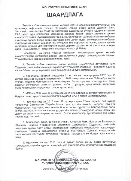 Тэгвэл өнөөдөр Монголын Боловсрол, Шинжлэх Ухааны Үйлдвэрчний Эвлэлийн холбооноос боловсрол, шинжлэх ухааны салбарын ажилтнуудын цалин хөлсийг 2018 оны хоёрдугаар улиралд багтаан нэн даруй нэмэх зайлшгүй шаардлагатай байна гэж үзэн Засгийн Газраас шаардлаа.