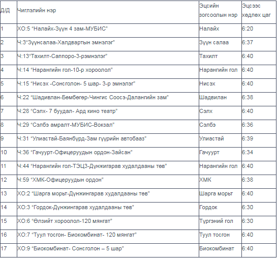 Нийтийн тээврийн үйлчилгээний цагийн хуваарьт дараах өөрчлөлт хийгдэж байна.