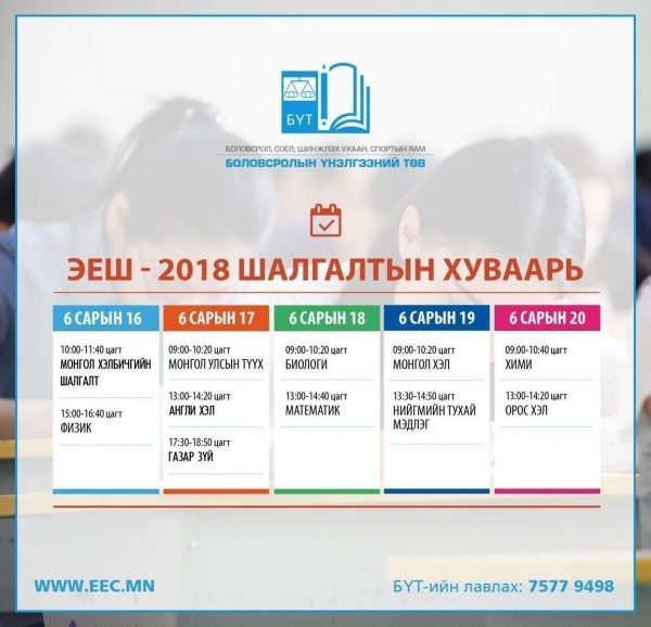 Элсэлтийн Ерөнхий Шалгалтын бүртгэлийн хугацаа 2018 оны дөрөвдүгээр сарын 16-нд дууслаа. Эхний шалгалт зургаадугаар сарын 16-нд эхэлнэ.