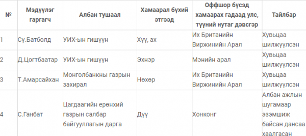 Түүнчлэн оффшор бүсэд хамаарах гадаад улсад албаны чиг үүргээ хэрэгжүүлэх, суралцах, эмнэлгийн тусламж, үйлчилгээ авах зорилгоор банкинд данс нээлгэсэн, мөнгөн хөрөнгө байршуулсан, хөдлөх ба үл хөдлөх хөрөнгө өмчилсөн 16 албан тушаалтан энэ талаараа Авлигатай тэмцэх газарт бичгээр мэдэгдэж бүртгүүлсэн байна.