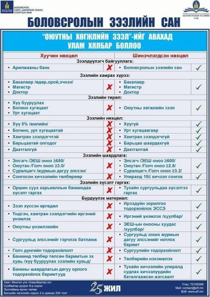 Зээлийг арилжааны банкаар бус “Боловсролын зээлийн сан”-гаар дамжуулан өгнө. Ингэхдээ хүүгүй, урт хугагаар, барьцаа шаардахгүй, хамтран зээлдэгчгүй, даатгалтайгаар олгох юм байна.