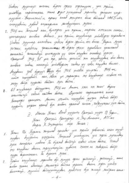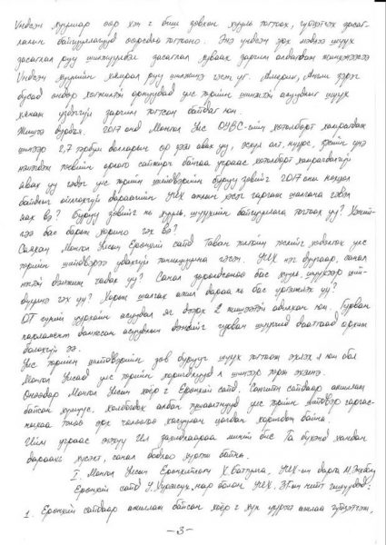 3. Оюутолгойн асуудлаар байгуулсан УИХ-ын Ажлын хэсэг нэг талыг барьж ажиллахгүй гэдэгт найдаж байна. Дүгнэлтээ гаргахаасаа өмнө хэлэлцээрт оролцсон ажлын хэсгийн гишүүдтэй уулзаж тэдний байр суурийг шорон оронд бус албан өрөөнд сонсож, тодруулахыг хүсэж байна.