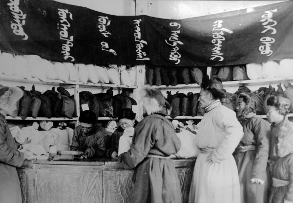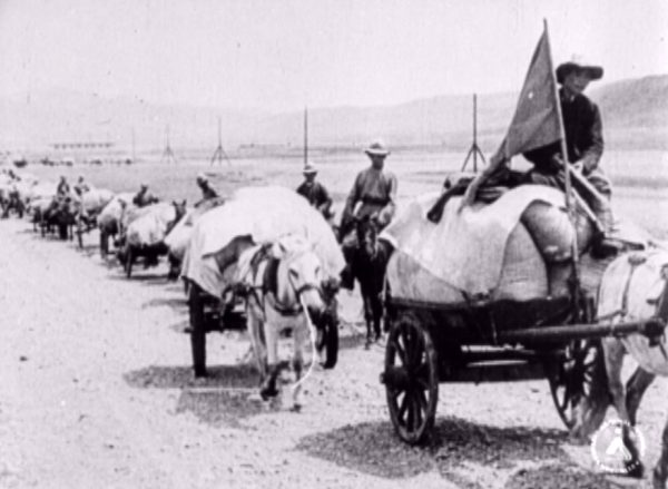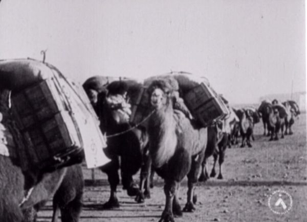 Фронтод илгээх бэлэглэлийн эд зүйлсийг Бэлэглэлийн төв комисст хүлээлгэн өгөхөөр хөдөө орон нутгаас адуу, тэмээн жинд ачиж явж байгаа нь. 1943 он. Кино, гэрэл зураг, дуу авианы баримтын архив.