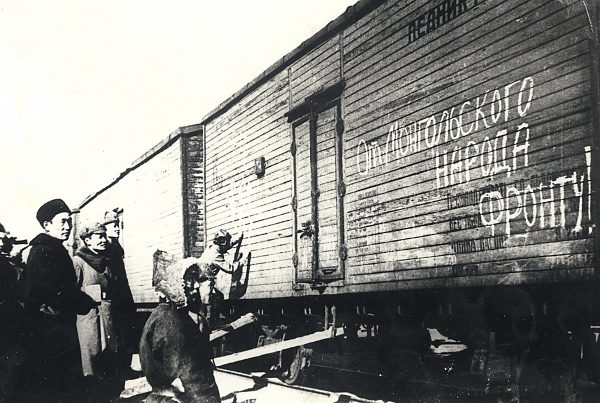 Монголын ард түмэн Улаан армид зориулсан бэлэглэлийн вагоны цувааг аян замд үдэн гаргаж байгаа нь. 1943 он. АВП РФ. Фотография.