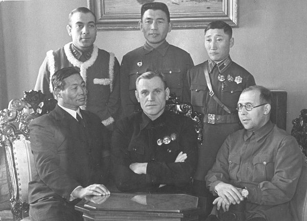 Фронтод очоод ирсний дараа. Урд эгнээнд зүүн гараас: БНМАУ-аас ЗСБНХУ-д суугаа Элчин төлөөлөгч Ж.Самбуу, ЗСБНХУ-аас  БНМАУ-д суугаа Элчин төлөөлөгч И.А.Иванов, Гадаад хэргийн ардын комиссарын ажилтан Сидоров нар. 1943 он. АВП РФ, ф. 779, д. 100- фотография