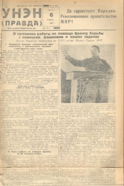Үнэн” (Правда) сонинд нийтлэгдсэн БНМАУ-ын 26 дугаар Бага Хуралд БНМАУ-ын Ерөнхий сайд Х.Чойбалсангийн тавьсан \”Германы фашизмтай тэмцсэн фронтод туслах ажлын явц ба манай зорилгын тухай” сэдэвт илтгэл. 1943.03.06. № 55/265/