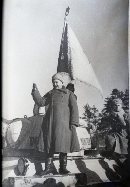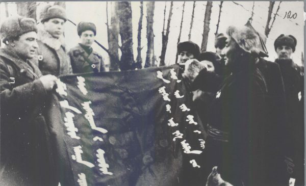Баруун фронтын Улаан цэргийн ангийн дайчдад Монголын ард түмний өмнөөс төлөөлөгч, сайн малчин Б.Пунцаг Улаан тугийг гардуулж байгаа нь. 1943.03.08. РГАКФД, 43. 0179373. Фотография
