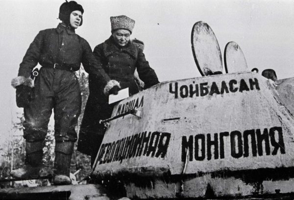Х.Чойбалсан Монголын ард түмний хөрөнгөөр бүтээсэн \”Хувьсгалт Монгол” танкийн цувааг Улаан армийн дайчдад хүлээлгэн өгч байгаа нь. 1943.01.12. РГАКФД. Арх. № 0-362041. Фотография.