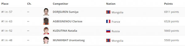 57 кг-д Л.Энхрийлэн 18, 63 кг-д Б.Мөнгөнчимэг 12 дугаар байрт бичигджээ. Манай бусад жүдочид жин тус бүрт 30-с дээш байрт эрэмбэлэгдэж байна.