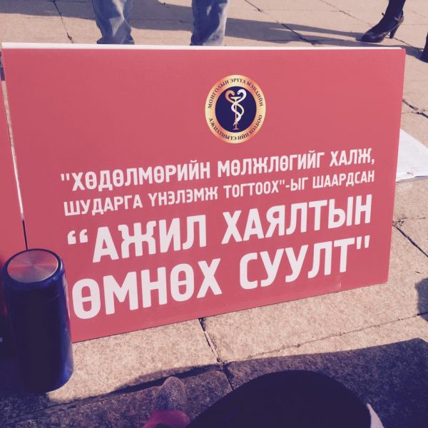 Монголын Эрүүл Мэндийн Үйлдвэрчний эвлэлийн холбооноос Засгийн Газраас эмч, эмнэлгийн ажилчдын цалин нэмэгдүүлэхийг шаардсан ажил хаялтын өмнөх суултыг өнөөдөр Сүхбаатарын талбайд хийлээ.