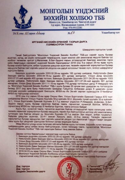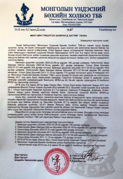 Энэхүү асуудлаар МҮБХ-ныхон ИНЕГ-ын дарга Л.Бямбасүрэн, МИАТ-ийн Гүйцэтгэх захирал Д.Баттөр нарт шаардлага хүргүүлжээ.
