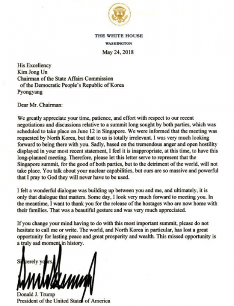 АНУ-ын Ерөнхийлөгч Дональд Трамп ирэх зургадугаар сарын 12-нд Сингапурт товлогдсон АНУ, БНАСАУ-ын дээд хэмжээний уулзалтыг цуцаллаа. Энэ тухайгаа Дональд Трамп Хойд Солонгосын удирдагчид захидлаар мэдэгдсэн байна.