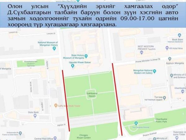 Олон улсын Хүүхдийн эрхийг хамгаалах өдөр баасан гаригт болно. Баярын үеэр Сүхбаатарын талбайд хүүхдүүд зориулсан баярын нэгдсэн арга хэмжээ зохион байгуулагддаг. Үүнтэй холбогдуулан Д.Сүхбаатарын талбайн баруун болон зүүн хэсгийн авто замын хөдөлгөөнийг зургаадугаар сарын нэгний өдрийн 09.00-17.00 цагийн хооронд түр хугацаагаар хязгаарлах юм байна.