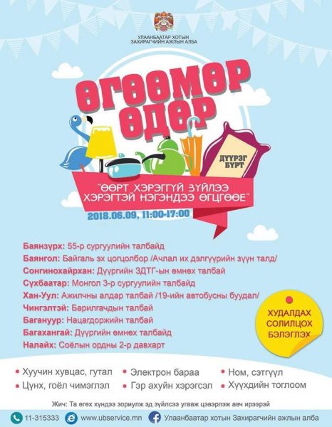 Хуучин эд зүйлсээ худалдах, солилцох, үнэ төлбөргүй бусдад хандивлах “Өгөөмөр өдөр” өдөрлөг энэ Бямба гарагт болох гэж байна. Хог хаягдлыг эх үүсвэр дээр нь ангилан ялгах, багасгах, бууруулах, дахин ашиглахад иргэдийн мэдлэг, оролцоог нэмэгдүүлэх зорилготой энэ өдөрлөг нийслэлийн 9 дүүрэгт зохион байгуулагдана.